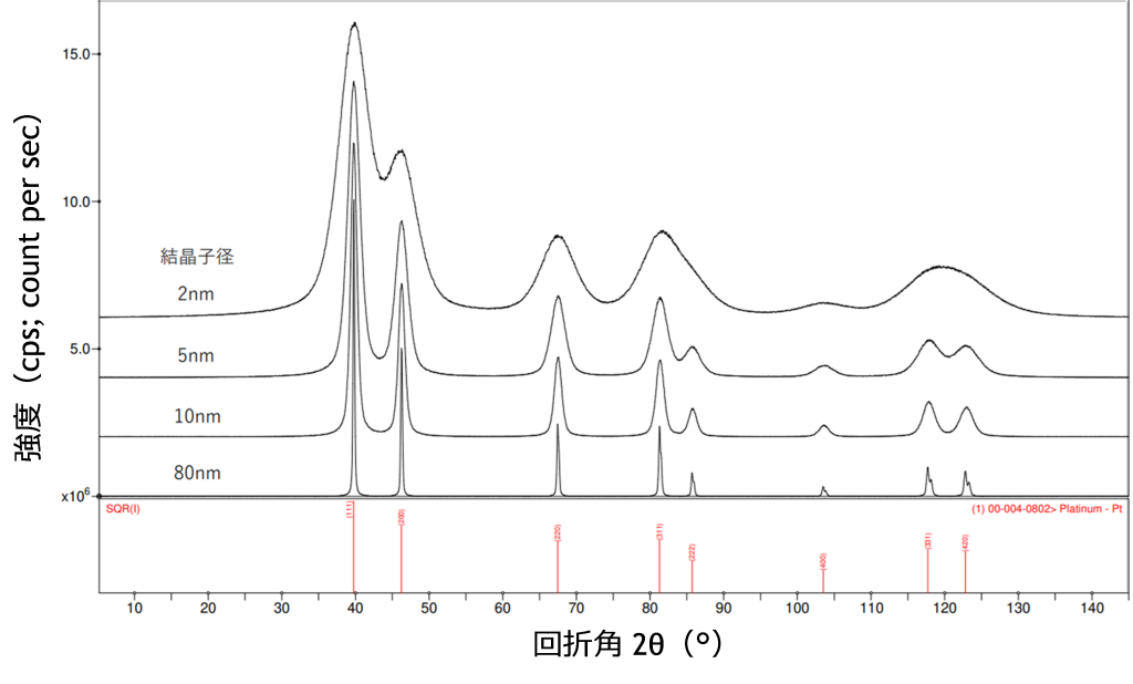 触媒機能に重要な影響を与える結晶子径(結晶の大きさ)依存を表示した例を示す。