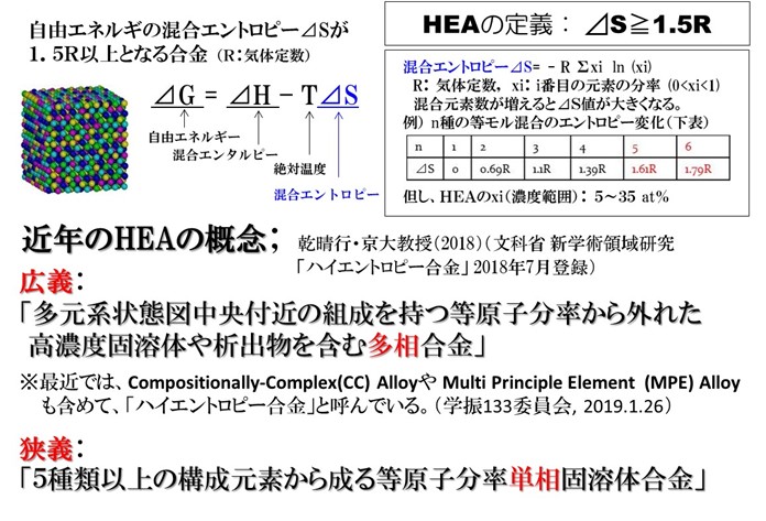 ハイエントロピー合金(HEA;High-Entropy Alloy)の定義を、図3に示します。等モル比で元素を合金化した場合、5元素以上を含む場合HEAの定義を満たし、高温強度などを含む特性において、従来にはみられない著しく優れた種々の特性を示すことで知られています。その研究の歴史は浅く、近年になり大学等を中心に基礎研究や社会実装研究開発が加速されています。また金属用3Dプリンターの発展に伴い、大型のHEAを狭義(単相)の意味で作製可能となりつつありますが、多相のHEAでも優れた材料特性を示すことや、中程度のエントロピー合金でもHEAに匹敵する特異で優れた材料を作製可能なことから実用化が進みつつあります。