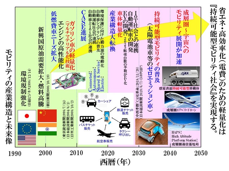 弊社の将来ビジョンとして「モビリティの軽量化による未来社会の変革構想」を掲げています(図4)。電気自動車だけでなく、成層圏から宇宙へという壮大な技術開発が進められつつある中で、お客様のビジネスを、軽量HEAを中心とする材料開発の面からご支援いたします。